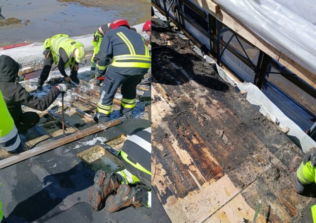 Slökkviliðsmenn og verktakar rífa upp þakið á nýbyggingu við hjúkrunarheimilið Skjólgarð eftir brunann í sumar. Rífa þurfi upp um 70 fermetra af þakinu. Það hefur gengið á ýmsu í byggingu á nýju og stækkuðu hjúkunrarheimili á Hornafirði og Húsheild-hyrna segir viðbúið að gera þurf verkið upp með aðstoð lögfræðinga. Aðsend mynd – Húsheild-Hyrna