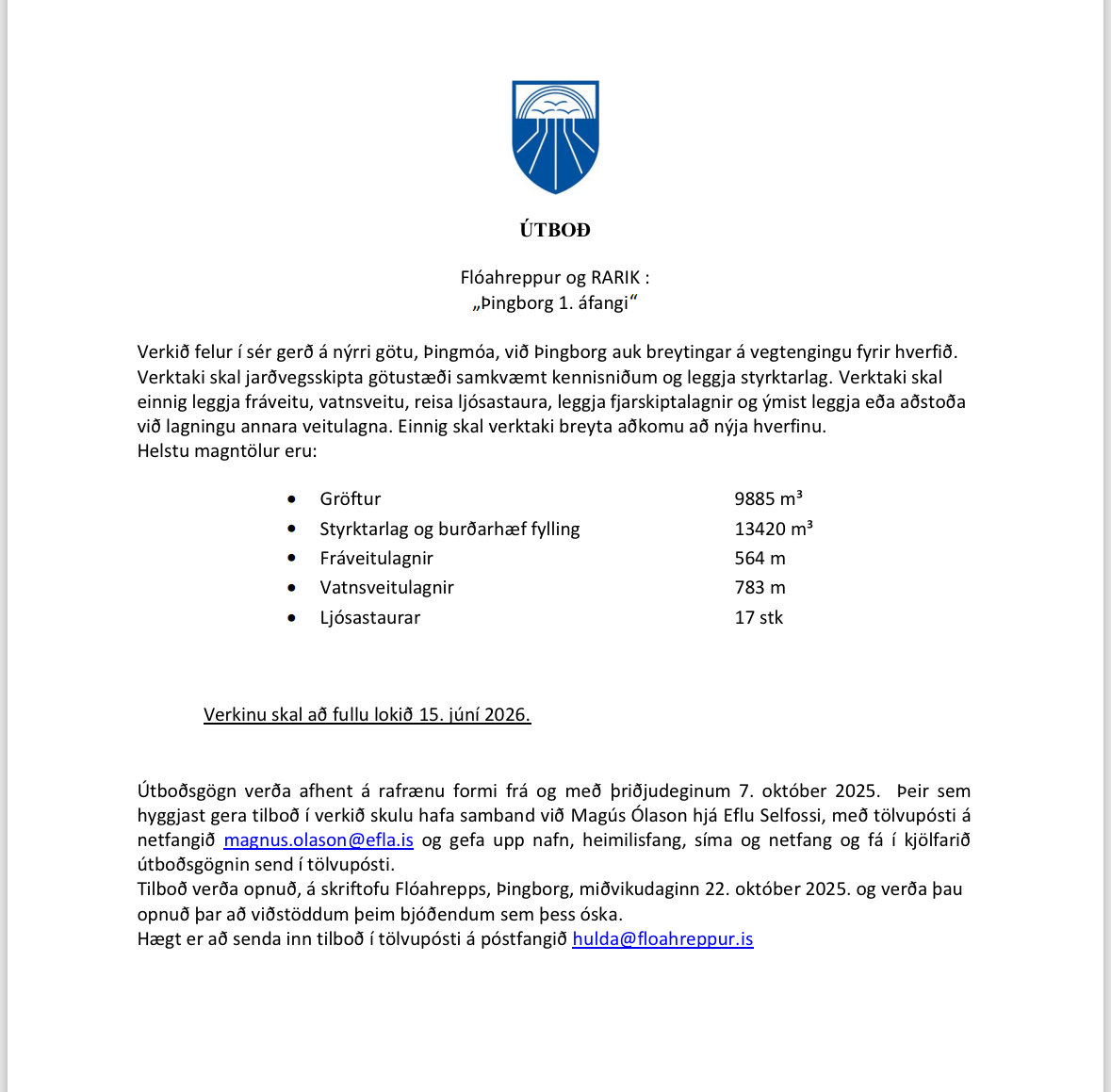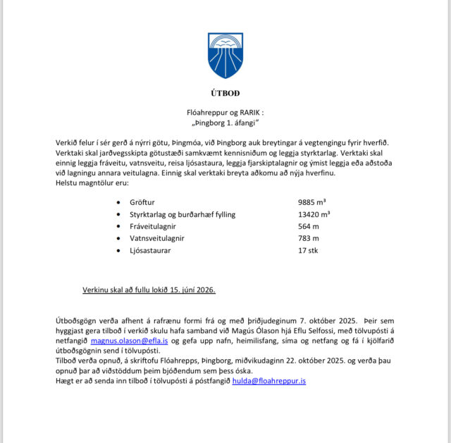 Tilboð verða opnuð, á skrifstofu Flóahrepps, Þingborg, miðvikudaginn 22. október 2025. og verða þau opnuð þar að viðstöddum þeim bjóðendum sem þess óska.