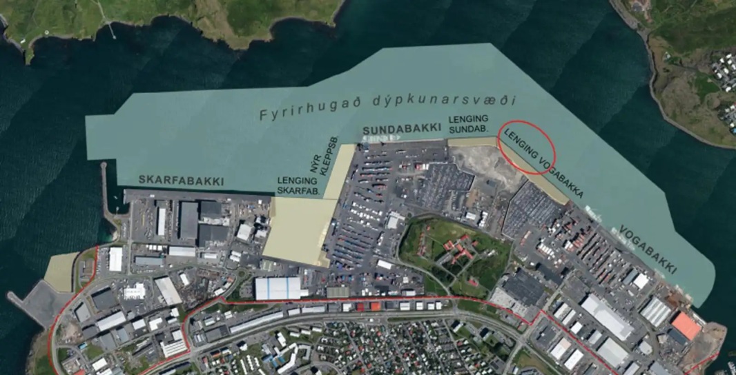 Landfyllingar og dýpkunarsvæði sem voru til umfjöllunar í umhverfismatsferlinu sem lauk 2022. Nýtt framkvæmdasvæði er auðkennt með rauðum hring.