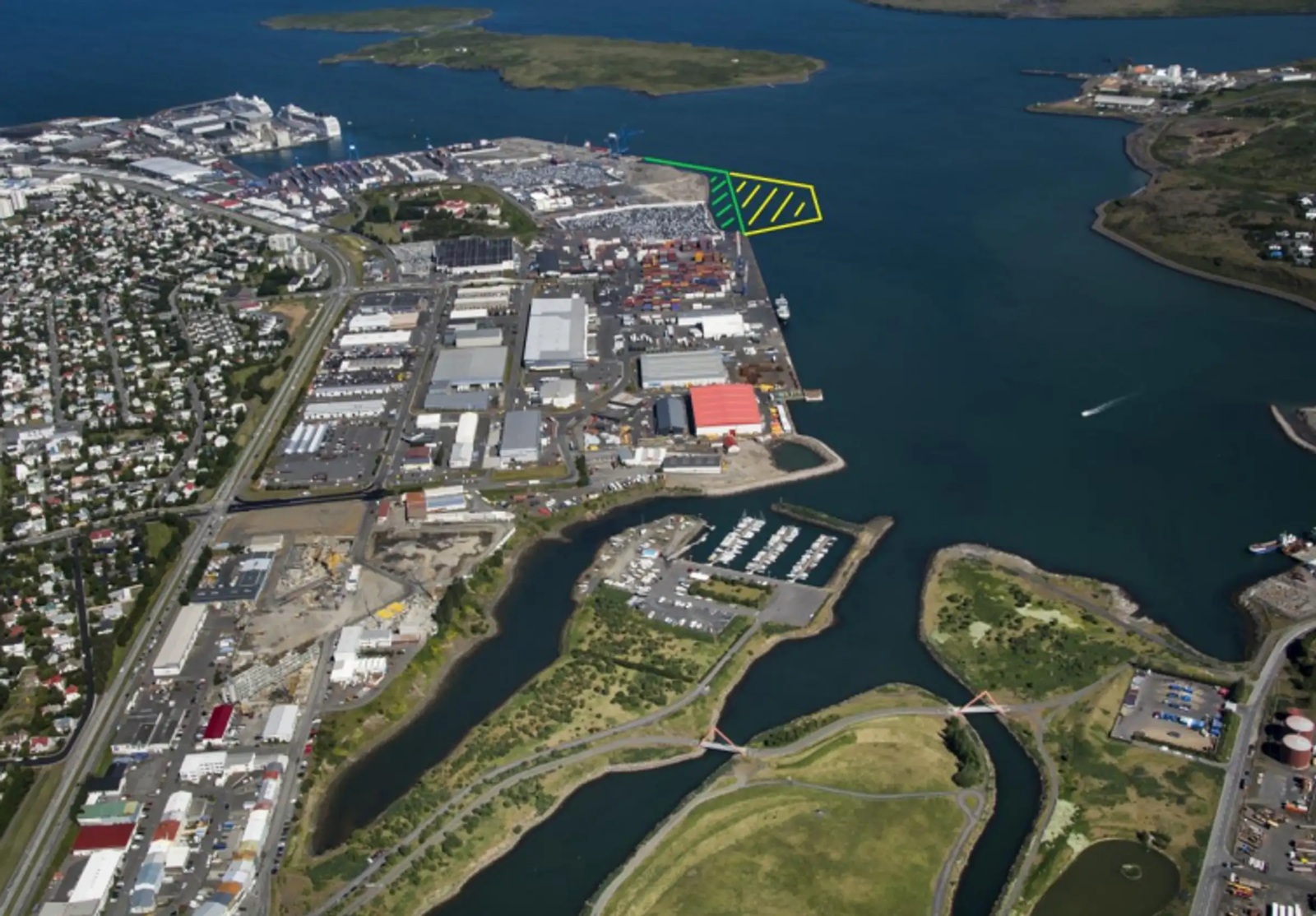 Horft frá ósum Elliðaánna í norður yfir Sundahöfn, Elliðaárvog, Viðey og Gufunes. Ný landfylling er gulmerkt, og kemur hún utan á landfyllingu sem var til umfjöllunar í umhverfismatsferlinu sem lauk árið 2022 (græn). – Efla