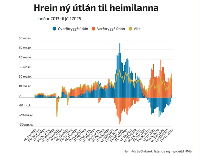 Þegar horft er á fasteignamarkaðinn hér á landi er athyglisvert að þrátt fyrir hátt raunvaxtastig námu hrein ný íbúðalán til heimila alls 25,2 milljörðum króna í júlí. Leita þarf aftur til sama mánaðar árið 2021 til að finna hærri lánveitingar heimila vegna fasteignakaupa í einum mánuði, að því er kemur fram í mánaðarskýrslu HMS.
