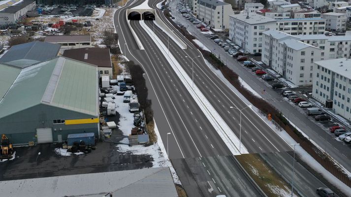 Ef jarðgöng yrðu valin myndi gangamunni suðaustan Laugarness líta svona út en gangamunni nær Holtagörðum myndi tengjast inn í Sæbrautarstokk og sæist ekki á yfirborði. Jarðgöng myndu útiloka hjólreiðamenn og gangandi vegfarendur.
