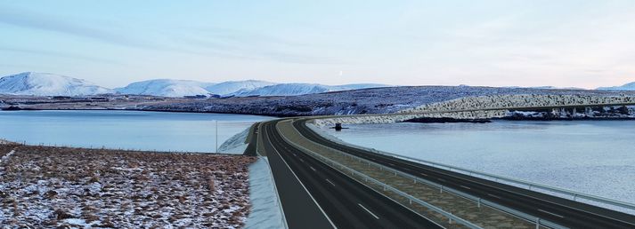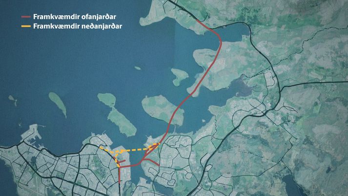 Frá Geldinganesi yfir á Gunnunes og Álfsnes yrði Sundabrautin bæði á grjótfyllingu yfir Leiruvog en einnig með nokkuð stórri brú og annarri minni.