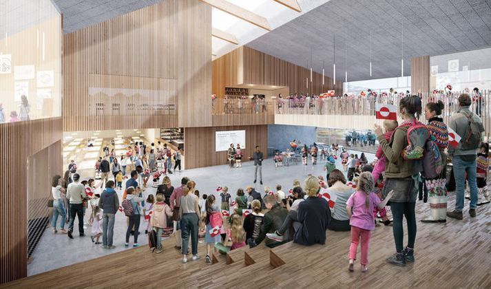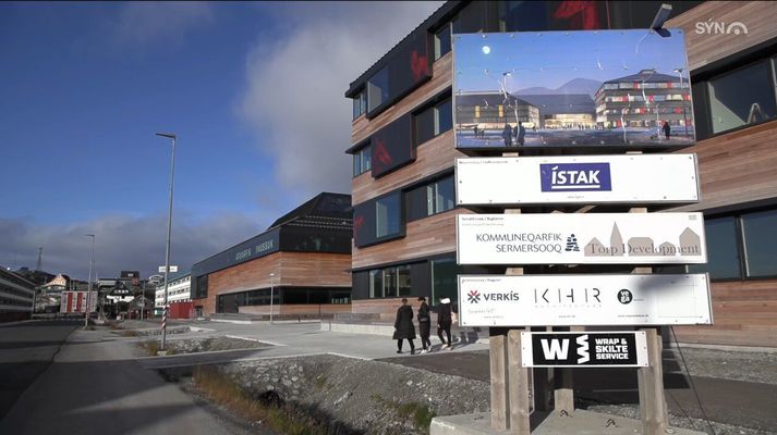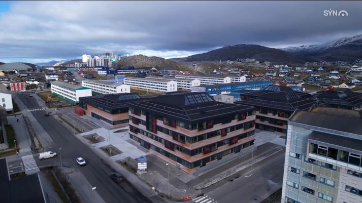 Sjá mátti skólann í kvöldfréttum Sýnar en hann er í miðbæ Nuuk. Hann er samtals um átján þúsund fermetrar að stærð, í sjö samtengdum byggingum, og er honum ætlað að verða krúnudjásnið í grænlenska skólakerfinu.