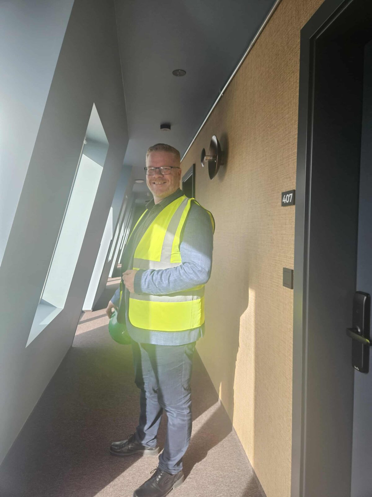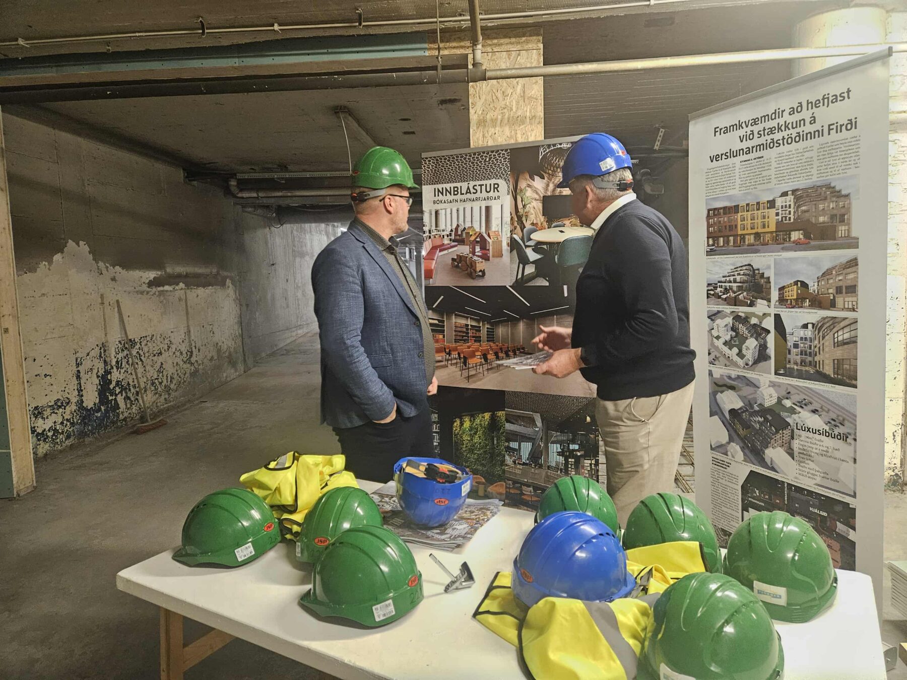 Guðmundur Bjarni Harðarson, framkvæmdastjóri Fjarðar, fylgdi bæjarstjóra um byggingarnar þennan dag. „Uppbyggingin gengur vel,“ segir hann. Áætlað er að verslunarkjarninn opni fyrir jól. Íbúðirnar eru nýkomnar í sölu og áhuginn er mikill. Við höfum aðeins haft þær í sölu í um hálfan mánuð og ég get sagt að salan fer vel af stað,“ lýsir hann.