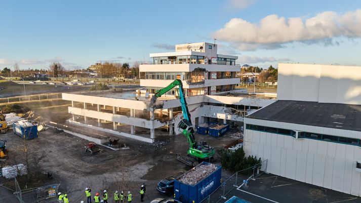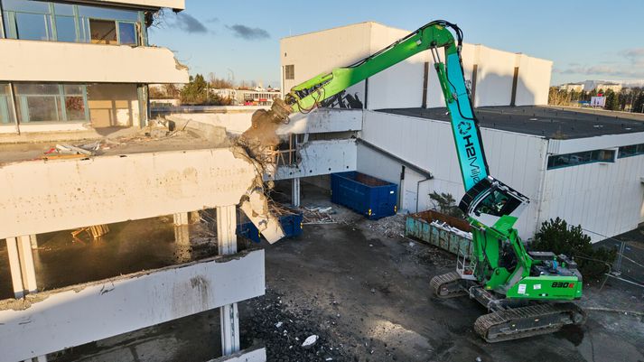 Fasteignafélagið Reitir vinnur nú að því að reisa 420 íbúða borgarhverfi á reitnum og síðustu vikur hefur undirbúningsvinna fyrir niðurrif hússins farið fram. Niðurrifið sjálft hófst svo í gær.