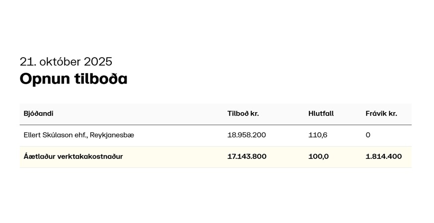 Ekki verður haldinn sérstakur opnunarfundur en eftir lok tilboðsfrests verður bjóðendum tilkynnt um nöfn bjóðenda í útboðinu, heildartilboðsupphæð og hvort tilboð sé sett fram sem frávikstilboð.