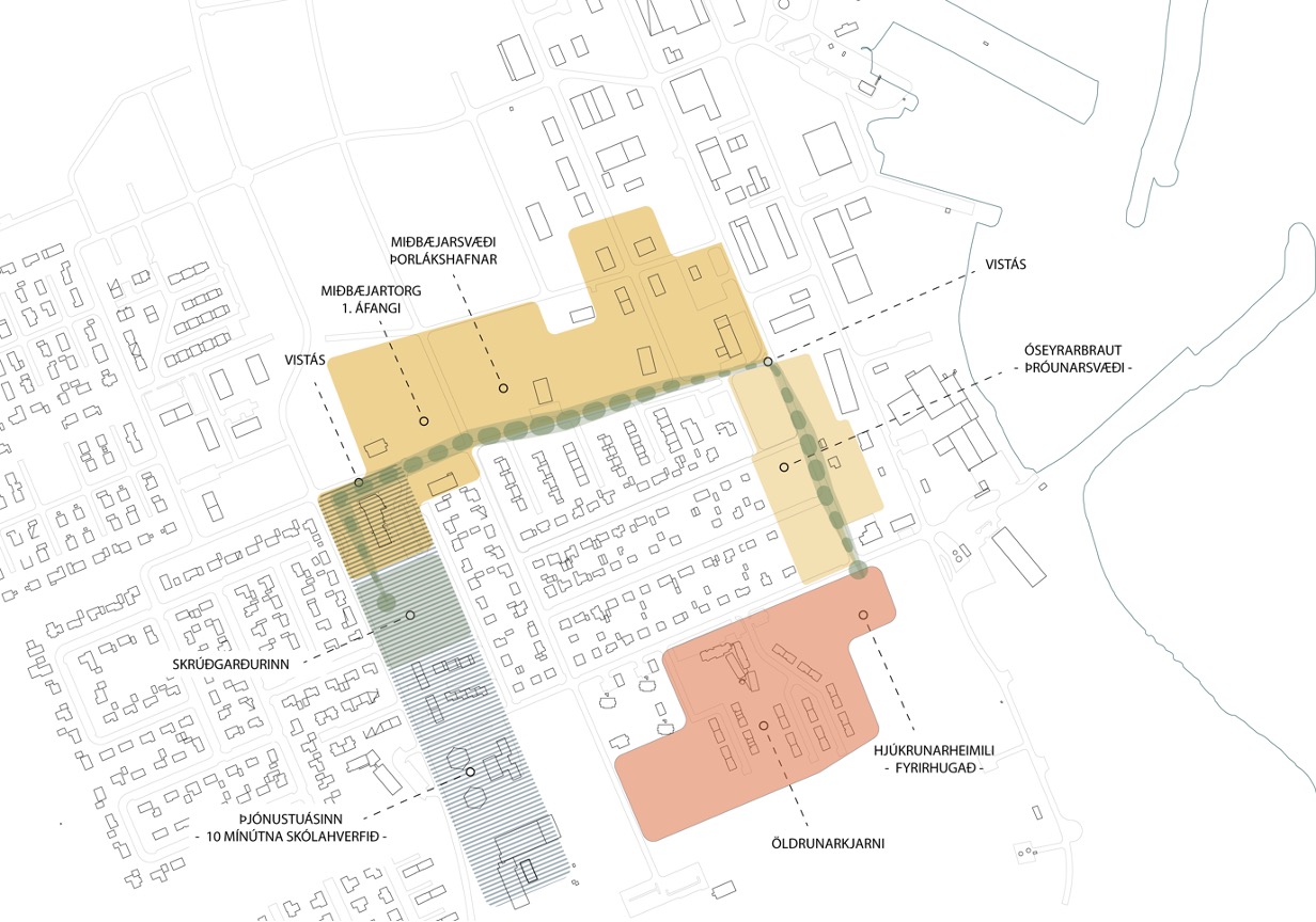 Ný byggð við Óseyrarbraut mun tengjast miðbænum meðfram Selvogsbraut og mynda þannig skýra tengingu milli eldri og nýrri hverfa bæjarins. Markmiðið er að skapa fjölbreytta og blandaða íbúðabyggð sem hentar ólíkum hópum samfélagsins og styrkir heildarmynd Þorlákshafnar. Lögð er áhersla á sameiginleg útisvæði sem hvetja til félagslegra samskipta og stuðla að sjálfbærum lífsstíl.