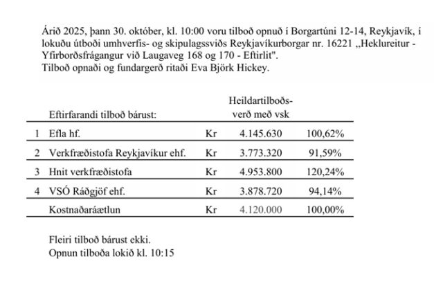 Home Fréttir Í fréttum Opnun útboðs: Heklureitur – Yfirborðsfrágangur við Laugaveg 168 og 170 – Eftirlit FréttirÍ fréttumNiðurstöður útboða Opnun útboðs: Heklureitur – Yfirborðsfrágangur við Laugaveg 168 og 170 – Eftirlit By byggingar - 31/10/2025 7 0 FacebookTwitterPinterestWhatsAppLinkedinEmailPrint Heimild: Reykjavik.is