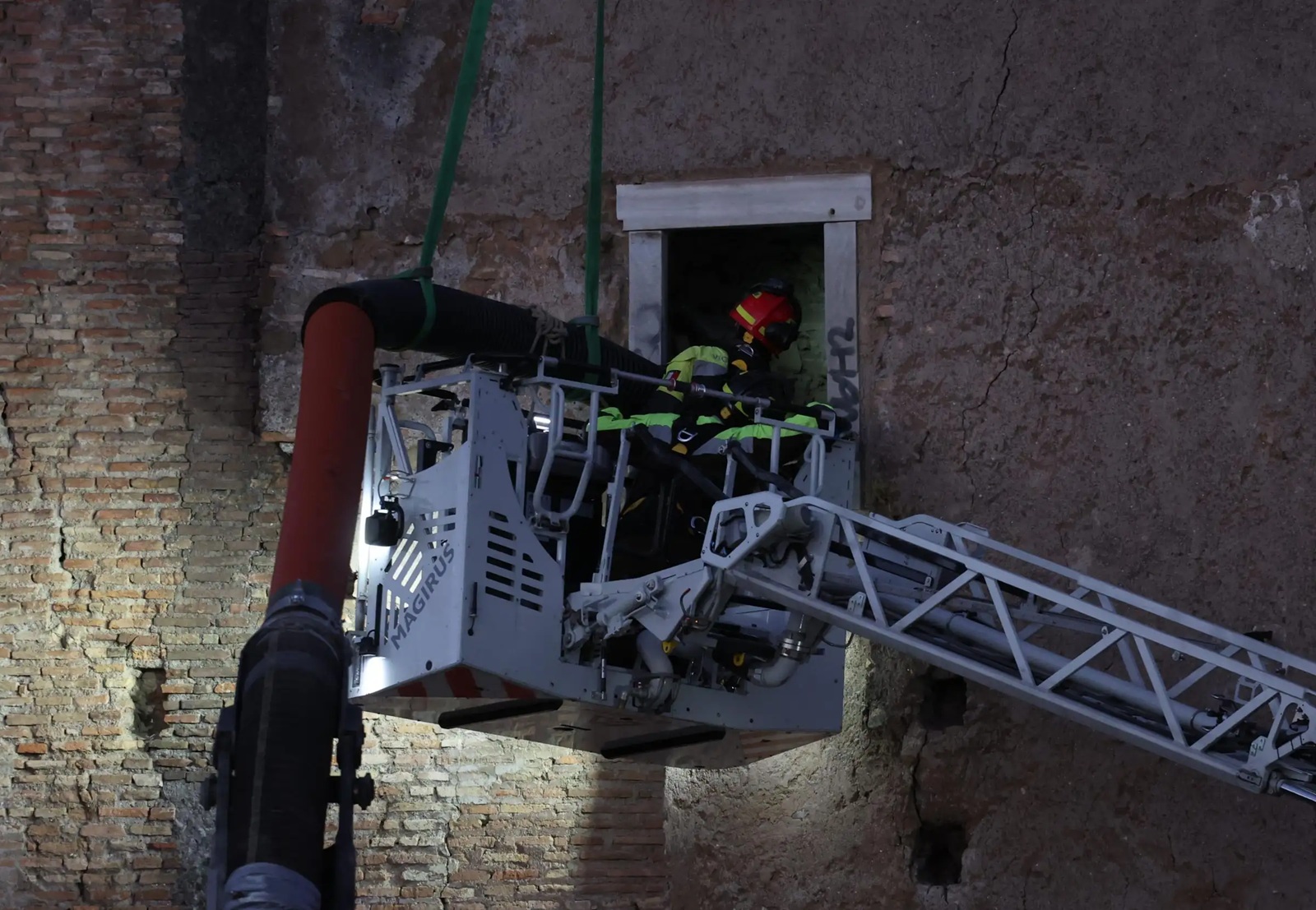 Björgunaraðgerðin var flókin í gær þar sem turninn var ótraustur og stöðugt smáhrun úr honum. Því varð að vinna hægt til að tryggja öryggi björgunarfólks.