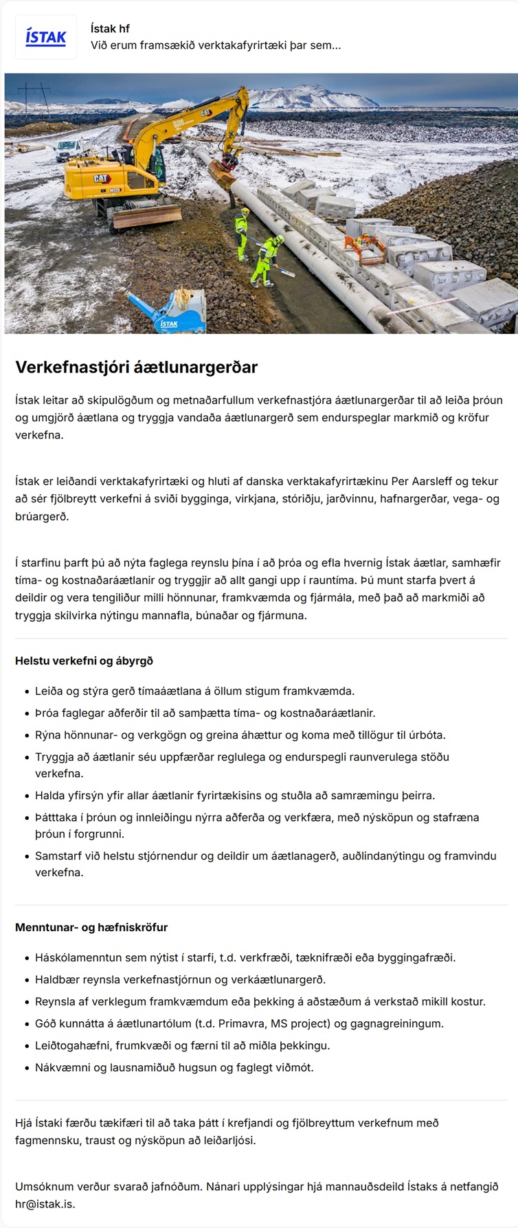 Home Fréttir Í fréttum 16.11.2025 Verkefnastjóri áætlunargerðar til Ístaks hf. FréttirÍ fréttumStörf 16.11.2025 Verkefnastjóri áætlunargerðar til Ístaks hf. By byggingar - 05/11/2025 34 0 FacebookTwitterPinterestWhatsAppLinkedinEmailPrint Heimild: Alfred.is