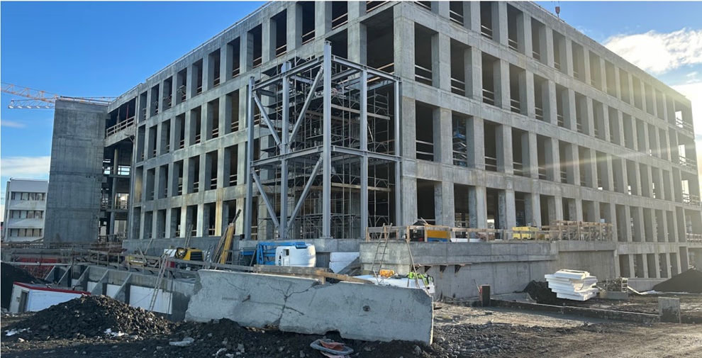 „Verktakinn vinnur nú að því að ljúka steypuvinnu í austari hluta hússins, sem klárast fljótlega. Stefnt er að því að uppsteypu hússins ljúki um svipað leyti, þó að uppsetning stálvirkja standi lengur og eftir er að setja upp stál fyrir utanáliggjandi flóttastigahús og tæknigöng,“ segir Árni Kristjánsson, staðarverkfræðingur hjá NLSH.
