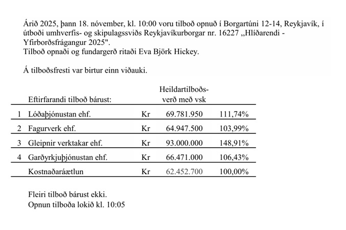 Home Fréttir Í fréttum Opnun útboðs: Hlíðarendi – Yfirborðsfrágangur 2025 FréttirÍ fréttumNiðurstöður útboða Opnun útboðs: Hlíðarendi – Yfirborðsfrágangur 2025 By byggingar - 19/11/2025 19 0 FacebookTwitterPinterestWhatsAppLinkedinEmailPrint Heimild: Reykjavik.is