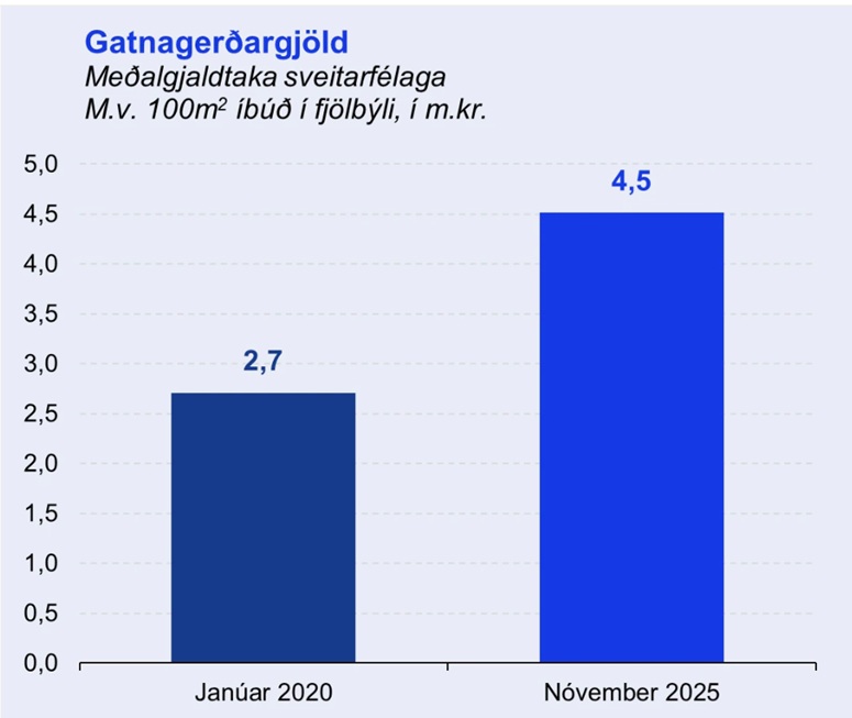 Þannig hafi gatnargerðargjöld að jafnaði numið 2,7 milljónum króna á hverjua 1010 fermetra íbúð árið 2020 en voru komin í 4,5 milljónir árið 2025.