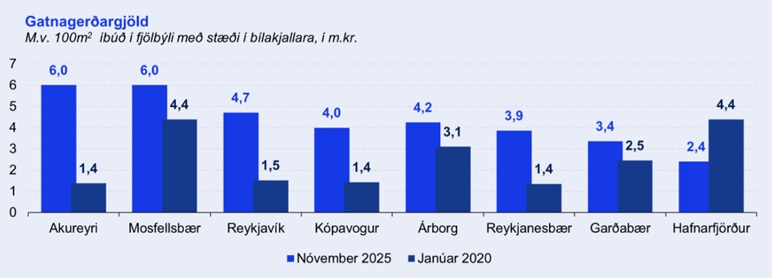 „Þegar litið er á þróun gatnagerðargjalda fyrir 100 fermetra íbúð í fjölbýli með stæði í bílakjallara má sjá að hún hefur í þessum sveitarfélögum að jafnaði hækkað um 67% eða 1,8 milljón krónur á íbúð á tímabilinu frá 2020 til 2025. Á sama tíma hækkaði byggingarvísitalan um 37%.“