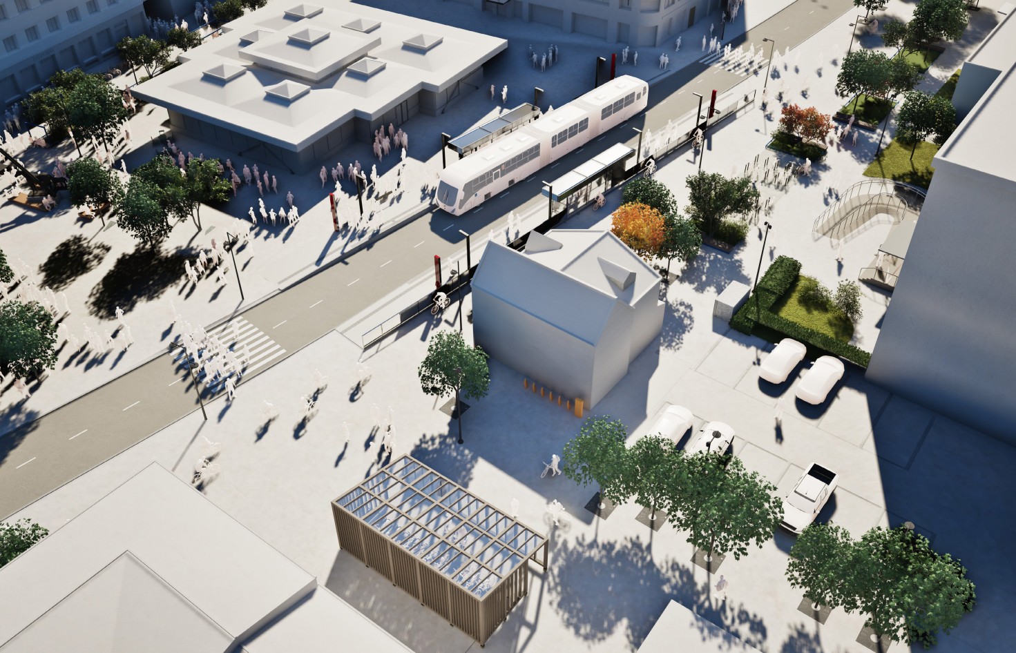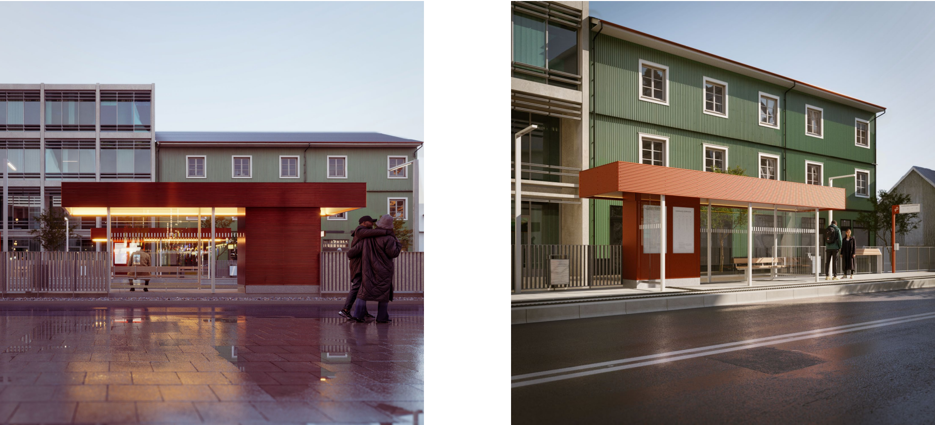 Dæmi um ásýnd Borgarlínuskýla og -palla.