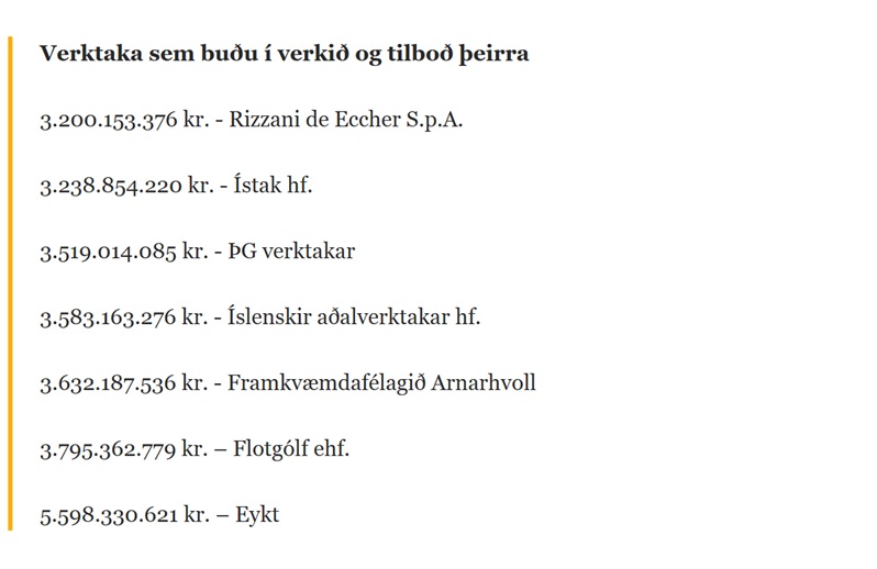 Sex íslensk verktakafyrirtæki buðu í verkið en svo fór að Rizzani de Eccher átti besta tilboðið upp á 3,2 milljarða króna. Ístak bauð rúmum sextíu milljónum krónum hærra í verkið sem telja má líklegt að hefði verið farsælli niðurstaða fyrir Kópavogsbæ.