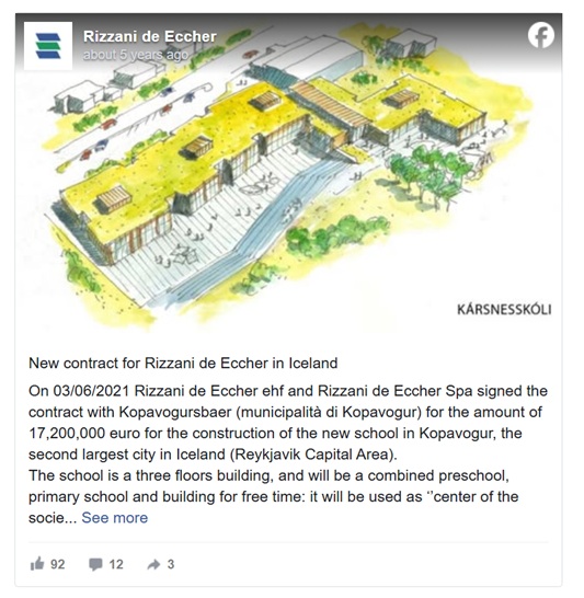 Ítalski verktakarisinn Rizzani de Eccher stofnaði samnefnt félag á Íslandi árið 2017. Félagið vakti nokkra neikvæða athygli fyrstu árin og datt svo í lukkupottinn árið 2021 þegar það varð hlutskarpast í útboði Kópavogsbæjar um byggingu nýs Kársnesskóla sem í dag heitir Barnaskóli Kársness.