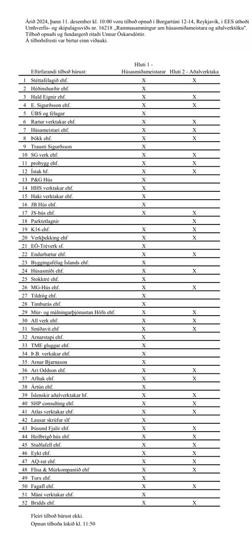 Home Fréttir Í fréttum Opnun útboðs: Rammasamningur Húsasmiðameistara og aðalaverktöku FréttirÍ fréttumNiðurstöður útboða Opnun útboðs: Rammasamningur Húsasmiðameistara og aðalaverktöku By byggingar - 13/12/2025 20 0 FacebookTwitterPinterestWhatsAppLinkedinEmailPrint Heimild: Reykjavik.is