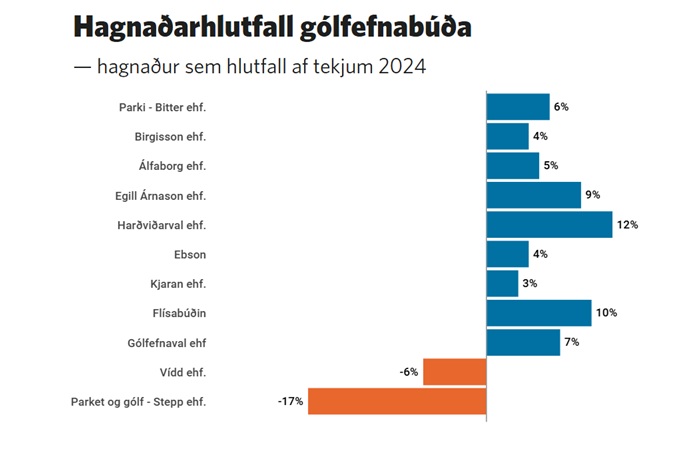 Álfaborg vermir þriðja sæti listans með ríflega 1,5 milljarða veltu í fyrra en tekjurnar jukust lítillega milli ára. Hagnaður félagsins nam 54 milljónum og dróst saman um 17 milljónir milli ára. Egill Árnason, sem velti tæplega 1,2 milljörðum í fyrra, er fjórða stærsta gólfefnabúð landsins en tekjur jukust um 20% milli ára. Félagið skilaði 78 milljóna króna hagnaði, sem er eilítið minna en árið 2023 þegar hagnaðurinn nam 85 milljónum.