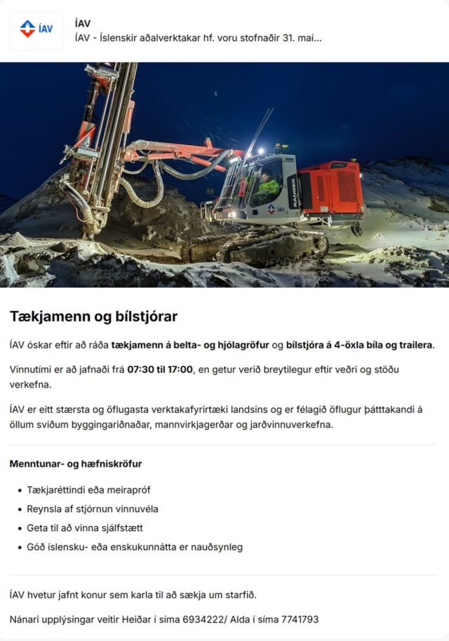 Home Fréttir Störf 22.01.2026 Tækjamenn og bílstjórar óskast til ÍAV FréttirStörf 22.01.2026 Tækjamenn og bílstjórar óskast til ÍAV By byggingar - 28/12/2025 17 0 FacebookTwitterPinterestWhatsAppLinkedinEmailPrint Heimild / Sjá frekar: Alfred.is