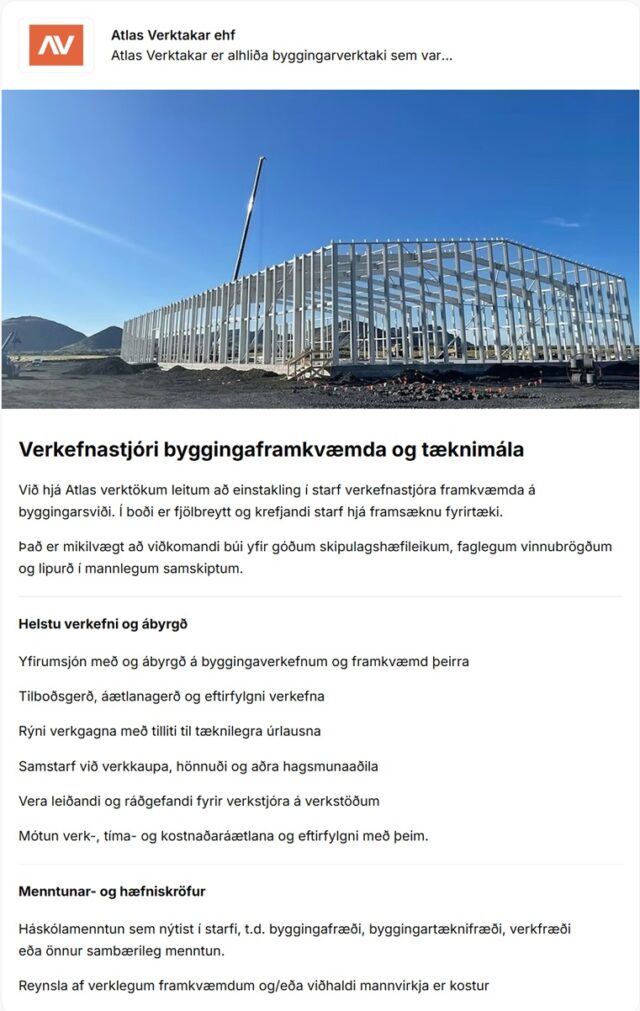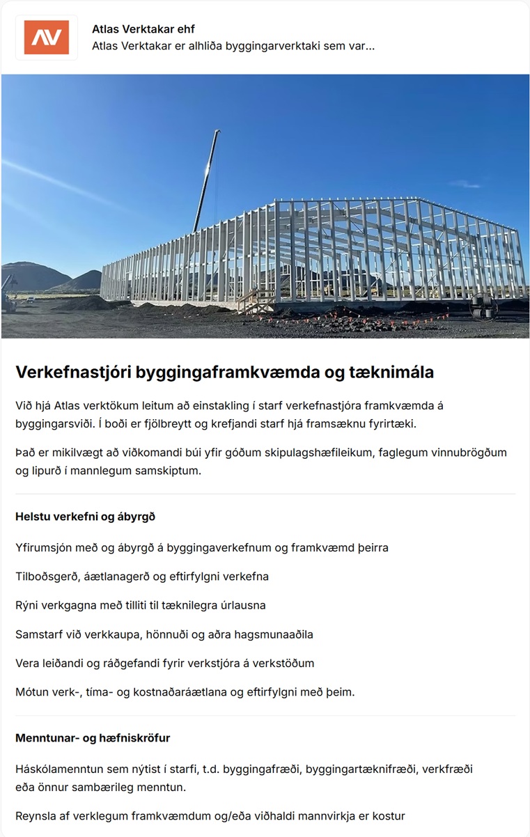 Home Fréttir Störf Verkefnastjóri byggingaframkvæmda og tæknimála hjá Atlas verktökum FréttirStörf Verkefnastjóri byggingaframkvæmda og tæknimála hjá Atlas verktökum By byggingar - 28/12/2025 32 0 FacebookTwitterPinterestWhatsAppLinkedinEmailPrint Heimild / Sjá frekar: Alfred.is