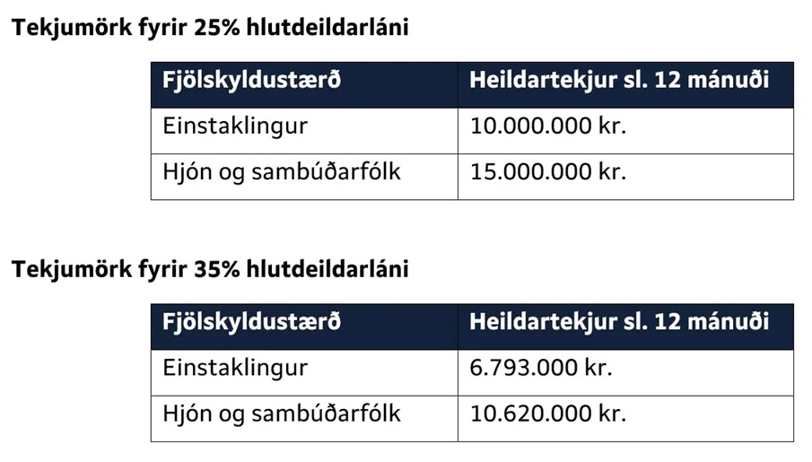 Tekjumörk hlutdeildarlána hækka einnig, bæði fyrir einstaklinga og hjón/sambúðarfólk. Uppfærð tekjumörk má sjá í töflunum hér að neðan.