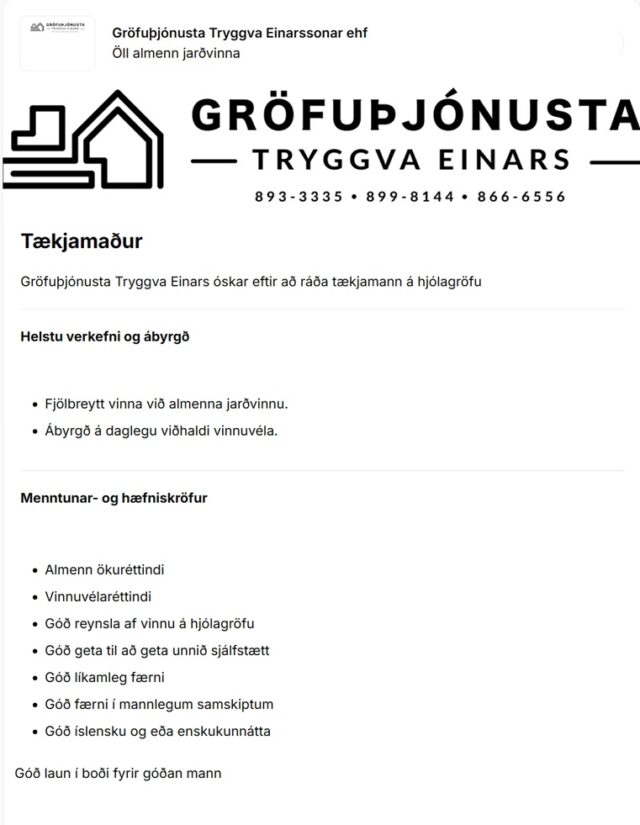 Home Fréttir Störf Tækjamaður óskast til Gröfuþjónustu Tryggva Einars FréttirStörf Tækjamaður óskast til Gröfuþjónustu Tryggva Einars By byggingar - 08/01/2026 34 0 FacebookTwitterPinterestWhatsAppLinkedinEmailPrint Heimild / Sjá frekar: Alfred.is