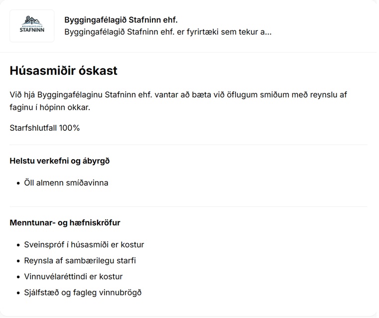 Home Fréttir Störf 15.01.2026 Byggingafélagið Stafninn ehf. óskar eftir húsasmiðum FréttirStörf 15.01.2026 Byggingafélagið Stafninn ehf. óskar eftir húsasmiðum By byggingar - 08/01/2026 27 0 FacebookTwitterPinterestWhatsAppLinkedinEmailPrint Heimild / Sjá frekar: Alfred.is