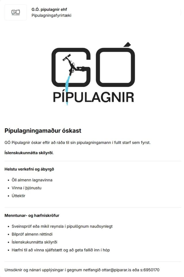 Home Fréttir Störf Pípulagningamaður óskast til GÓ Pípulagna ehf. FréttirStörf Pípulagningamaður óskast til GÓ Pípulagna ehf. By byggingar - 10/01/2026 13 0 FacebookTwitterPinterestWhatsAppLinkedinEmailPrint Heimild / Sjá frekar: Alfred.is