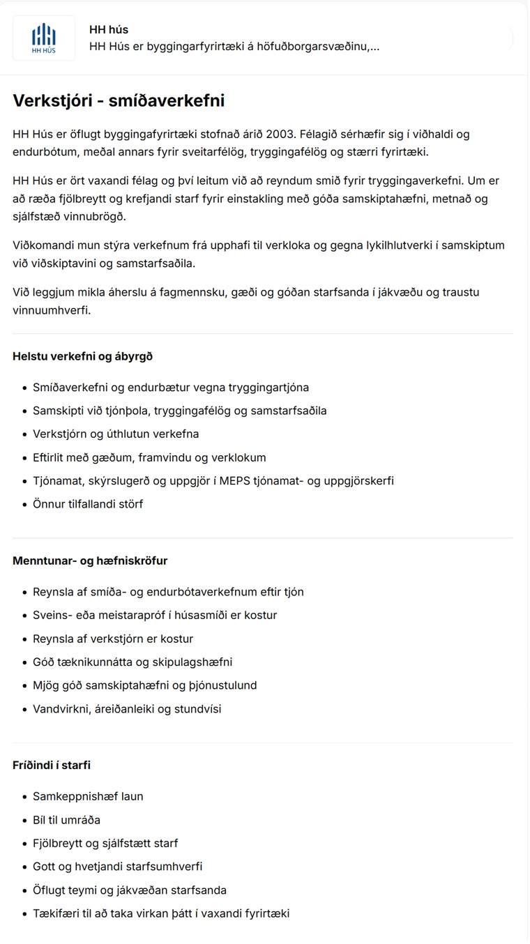 Home Fréttir Störf Verkstjóri óskast til HH Hús ehf. – smíðaverkefni FréttirStörf Verkstjóri óskast til HH Hús ehf. – smíðaverkefni By byggingar - 12/01/2026 58 0 FacebookTwitterPinterestWhatsAppLinkedinEmailPrint Heimild: Alfred.is