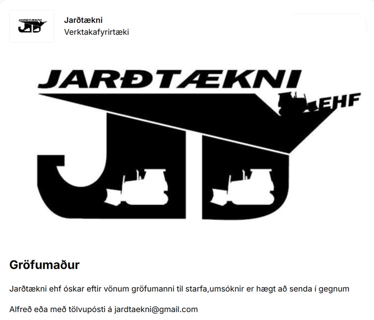 Home Fréttir Störf 26.01.2026 Gröfumaður óskast til Jarðtækni ehf. FréttirStörf 26.01.2026 Gröfumaður óskast til Jarðtækni ehf. By byggingar - 14/01/2026 16 0 FacebookTwitterPinterestWhatsAppLinkedinEmailPrint Heimild: Alfred.is