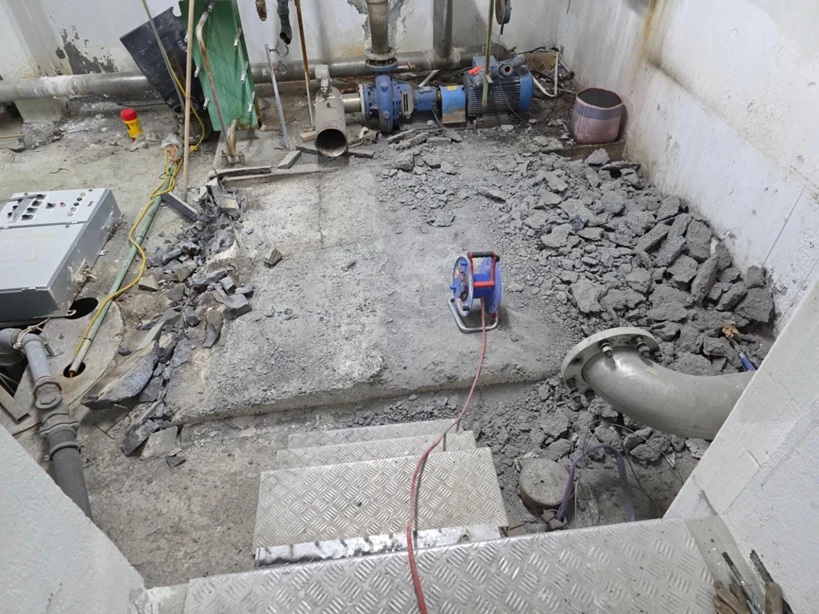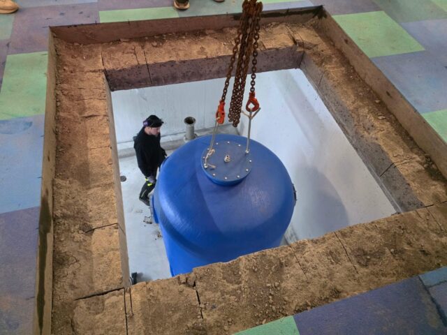 Pípulagningamenn eru þessa dagana að leggja allar lagnir að og frá síunum, á meðan rafvirkjar vinna að uppsetningu stjórntöflu fyrir allan búnað sandsíanna. Til að koma síunum fyrir þurfti að saga gat í gólfið sunnan við sundlaugina og þar verður í framtíðinni þjónustulúga sem auðveldar viðhald.