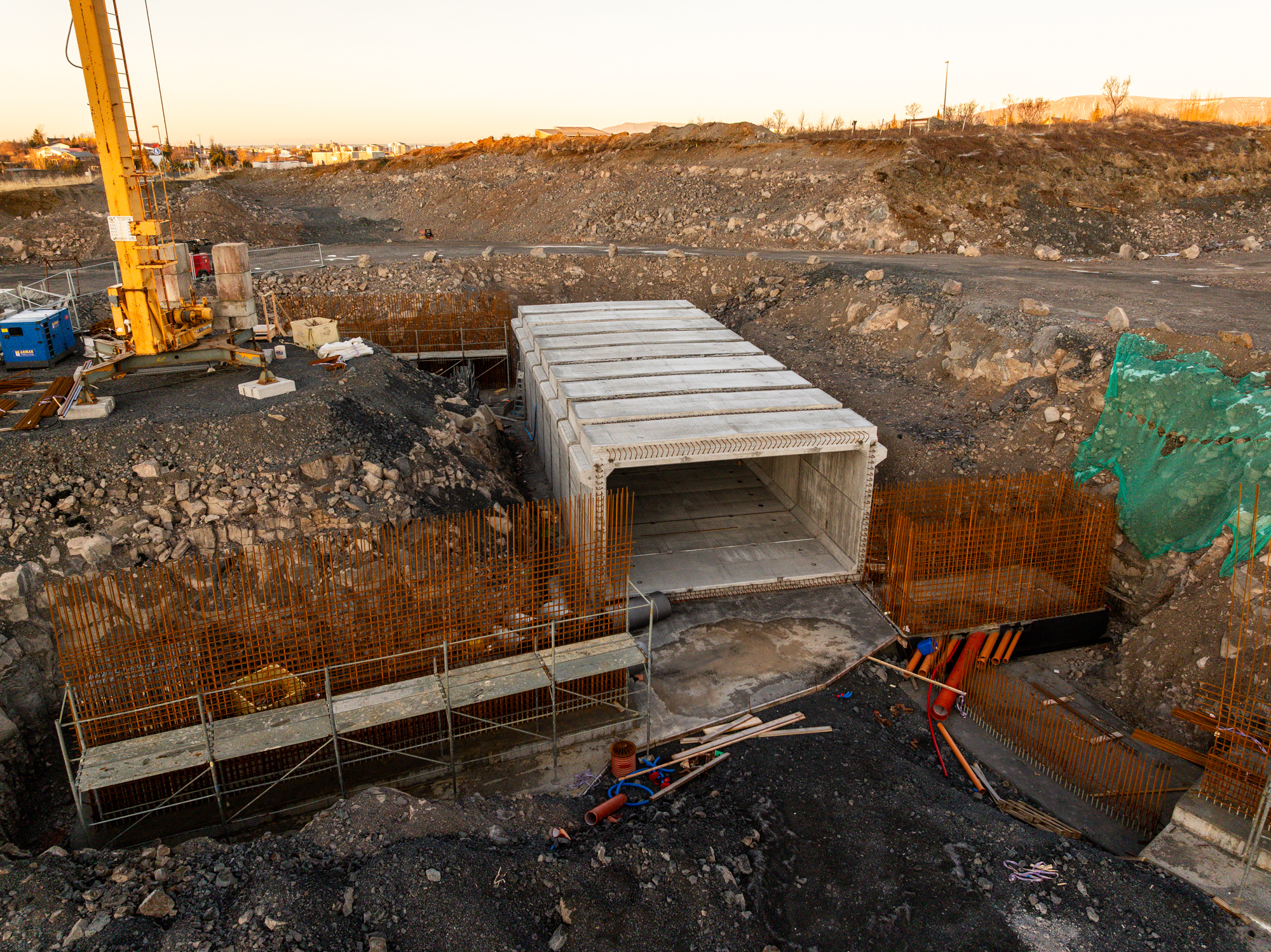 Ný undirgöng, sem eru í byggingu undir Arnarnesveg við Rjúpnaveg, eru að hluta til gerð úr forsteyptum einingum. Þær eru komnar á sinn stað og er nú unnið við frágang þeirra og uppslátt fyrir stoðveggjum sem munu koma við enda undirganganna.