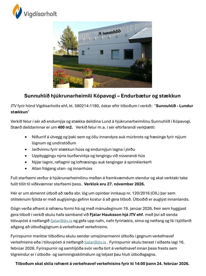 Home Fréttir Í fréttum 24.02.2026 Sunnuhlíð hjúkrunarheimili Kópavogi – Endurbætur og stækkun FréttirÍ fréttumÚtboð 24.02.2026 Sunnuhlíð hjúkrunarheimili Kópavogi – Endurbætur og stækkun By byggingar - 16/01/2026 61 0 FacebookTwitterPinterestWhatsAppLinkedinEmailPrint Óska eftir útboðsgögnum hjá JTV ehf. fjalar@jtv.is