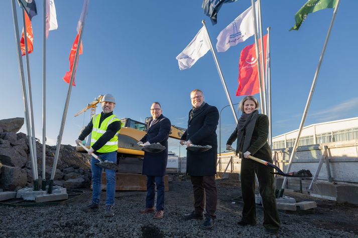 Ragnar Þór Ingólfsson húsnæðismálaráðherra, Pálmar Harðarson framkvæmdastjóri Þingvangs, Valdimar Víðisson bæjarstjóri Hafnarfjarðar, og Kristín Hrönn Guðmundsdóttir framkvæmdastjóri hjá Íslandsbanka, tóku í gær fyrstu skóflustunguna að stóru uppbyggingarverkefni við Hjallahraun í Hafnarfirði.