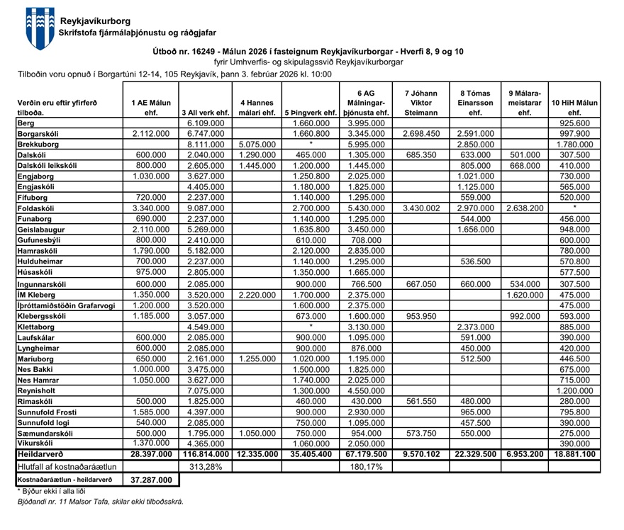 Home Fréttir Í fréttum Opnun útboðs: Málun 2026 – Hverfi 8-9-10 FréttirÍ fréttumNiðurstöður útboða Opnun útboðs: Málun 2026 – Hverfi 8-9-10 By byggingar - 17/02/2026 18 0 FacebookTwitterPinterestWhatsAppLinkedinEmailPrint Heimild: Reykjavik.is