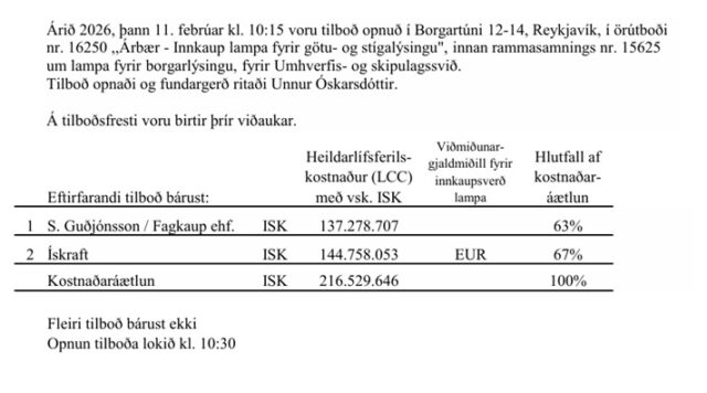 Home Fréttir Í fréttum Opnun útboðs: Árbær – Innkaup lampa fyrir götu- og stígalýsingu FréttirÍ fréttumNiðurstöður útboða Opnun útboðs: Árbær – Innkaup lampa fyrir götu- og stígalýsingu By byggingar - 18/02/2026 16 0 FacebookTwitterPinterestWhatsAppLinkedinEmailPrint Heimild: Reykjavik.is