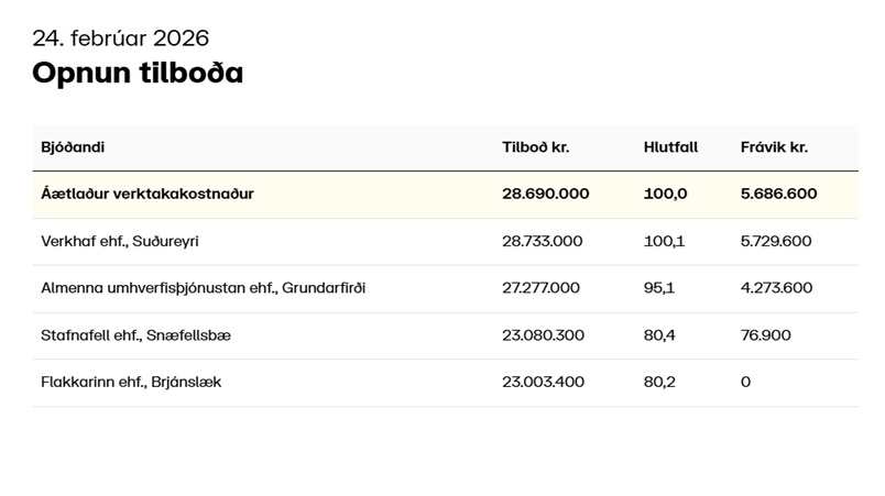 Tilboði skal skila rafrænt í útboðskerfinu TendSign fyrir kl. 14:00 þriðjudaginn 24. febrúar 2026.