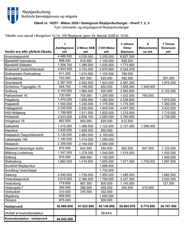 Home Fréttir Í fréttum Opnun útboðs: Málun í fasteignum Reykjavíkurborgar 2026 – Hverfi 1, 2, 3