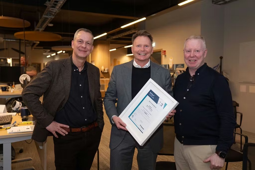 Guðni Aðalsteinsson, forstjóri Reita, tekur á móti viðurkenningunni frá Michael Aastrup, framkvæmdastjóra hjá Tarkett (vinstri), og Gunnari Þór Jóhannessyni, framkvæmdastjóra og eiganda Gólfefnavals (hægri).