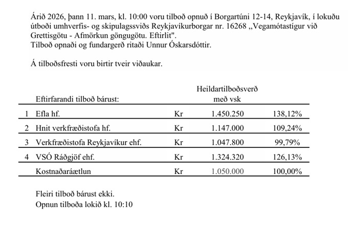 Home Fréttir Í fréttum Opnun útboðs: Vegamótastígur við Grettisgötu – Afmörkun göngugötu – Eftirlit FréttirÍ fréttumNiðurstöður útboða Opnun útboðs: Vegamótastígur við Grettisgötu – Afmörkun göngugötu – Eftirlit By byggingar - 17/03/2026 110 0 FacebookTwitterPinterestWhatsAppLinkedinEmailPrint Heimild: Reykjavíkurborg