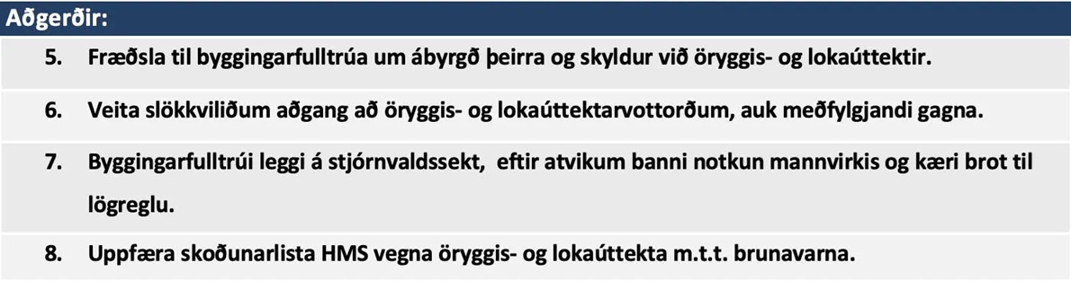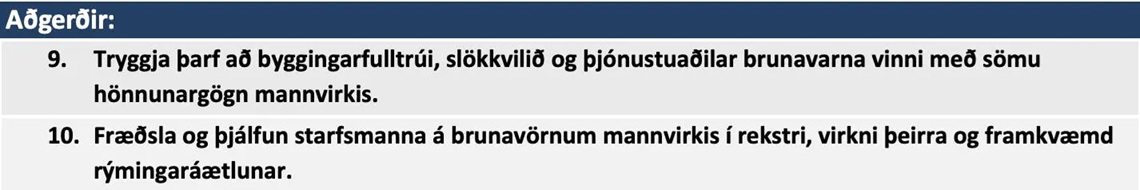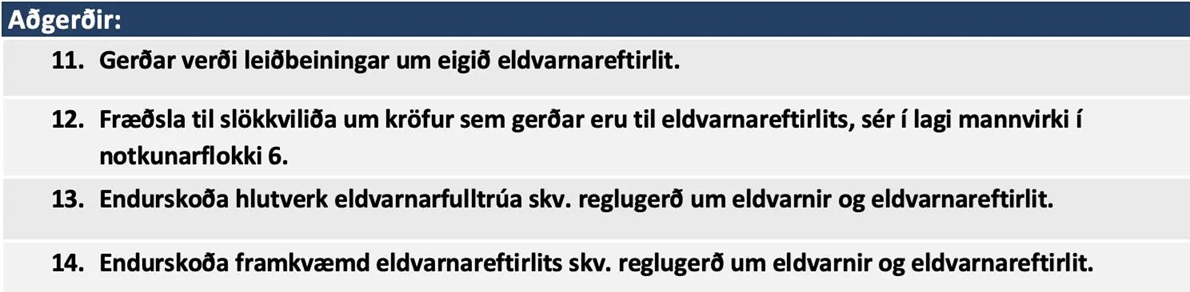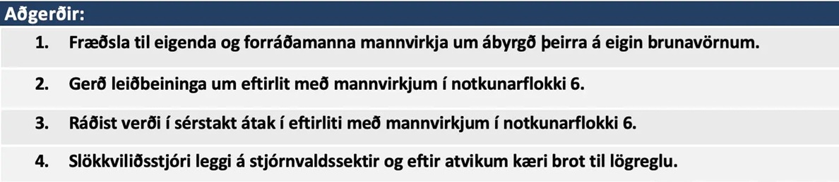 Í skýrslunni leggur HMS fram fjórar úrbótatillögur tengdum fræðslu, eftirliti með brunavörnum og endurskoðun regluverks