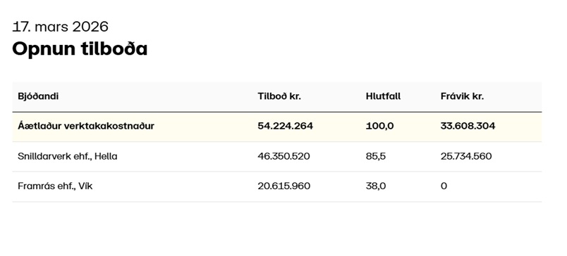 Ekki verður haldinn sérstakur opnunarfundur en eftir lok tilboðsfrests verður bjóðendum tilkynnt um nöfn bjóðenda og heildartilboðsupphæð.