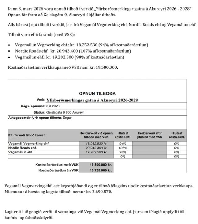 Lagt fram minnisblað dagsett 10. mars 2026 varðandi opnun tilboða í yfirborðsmerkingar gatna á Akureyri.