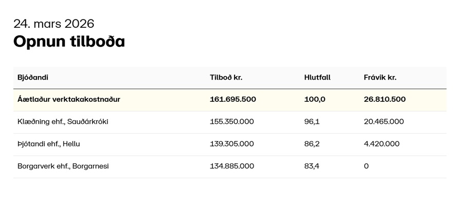 Útboðsgögn eru aðgengileg og verða afhent í rafræna útboðskerfinu  TendSign  frá og með þriðjudeginum 10.  mars 2026 og skal tilboðum skilað rafrænt í því útboðskerfi fyrir kl. 14:00 þriðjudaginn 24. mars 2026.