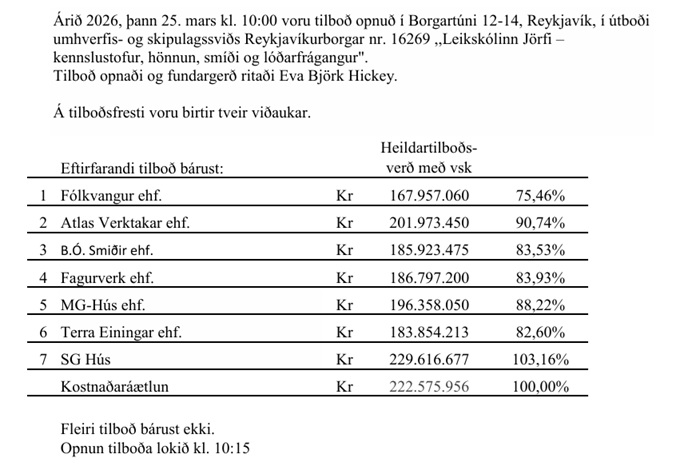 Home Fréttir Í fréttum Opnun útboðs: Leikskólinn Jörfi – kennslustofur, hönnun, smíði og lóðarfrágangur FréttirÍ fréttumNiðurstöður útboða Opnun útboðs: Leikskólinn Jörfi – kennslustofur, hönnun, smíði og lóðarfrágangur By byggingar - 27/03/2026 164 0 FacebookTwitterPinterestWhatsAppLinkedinEmailPrint Heimild: Reykjavik.is