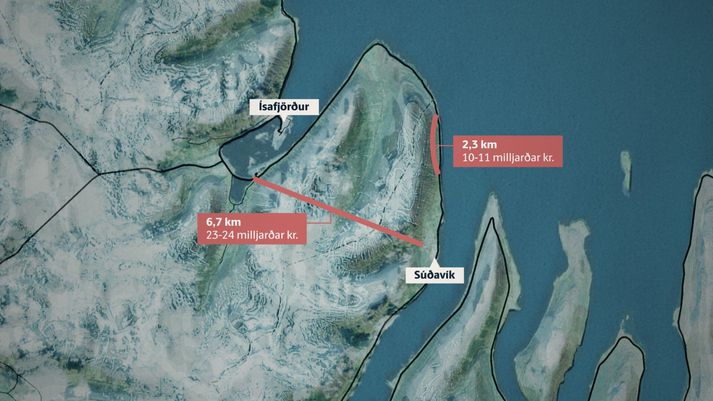Vegagerðin hefur núna fækkað valmöguleikunum niður í tvo. Eftir standa annarsvegar 2,3 kílómetra löng göng undir Súðavíkurhlíð. Með vegskálum eru þau talin kosta 10-11 milljarða króna, samkvæmt núvirtu kostnaðarmati Vegagerðarinnar.