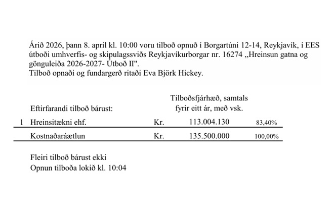 Home Fréttir Í fréttum Opnun útboðs: Hreinsun gatna og gönguleiða 2026-2027- Útboð II. EES FréttirÍ fréttumNiðurstöður útboða Opnun útboðs: Hreinsun gatna og gönguleiða 2026-2027- Útboð II. EES By byggingar - 10/04/2026 25 0 FacebookTwitterPinterestWhatsAppLinkedinEmailPrint Heimild: Reykjavík.is