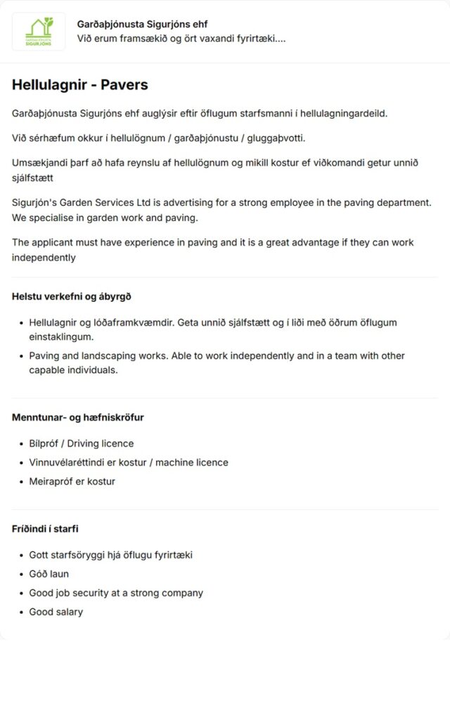 Home Fréttir Störf 24.04.2026 Hellulagnir – Pavers FréttirStörf 24.04.2026 Hellulagnir – Pavers By byggingar - 12/04/2026 17 0 FacebookTwitterPinterestWhatsAppLinkedinEmailPrint Heimild: Alfred.is